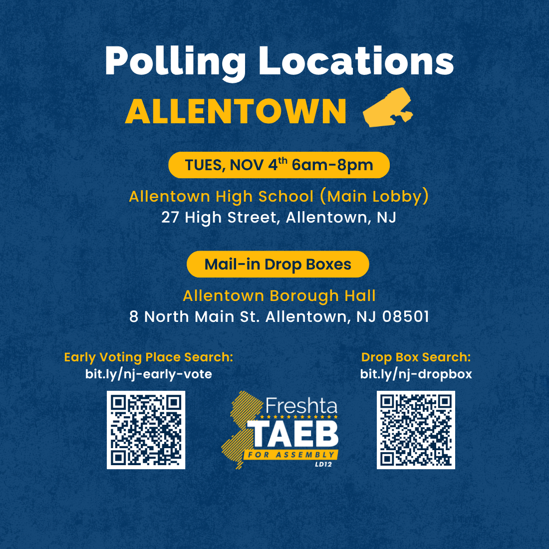 Polling Places Burlington Middlesex Monmouth Ocean ← → ← Burlington Middlesex Monmouth Ocean → Allentown Englishtown Helmetta Jackson Manalapan Matawan Millstone North Hanover Old Bridge Plumsted Roosevelt Spotswood Upper Freehold ← → ← Allentown Englishtown Helmetta Jackson Manalapan Matawan Millstone North Hanover Old Bridge Plumsted Roosevelt Spotswood Upper Freehold →